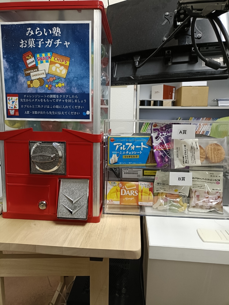 クリアできたら先生からメダルをもらい、お菓子ガチャを回すことができます。